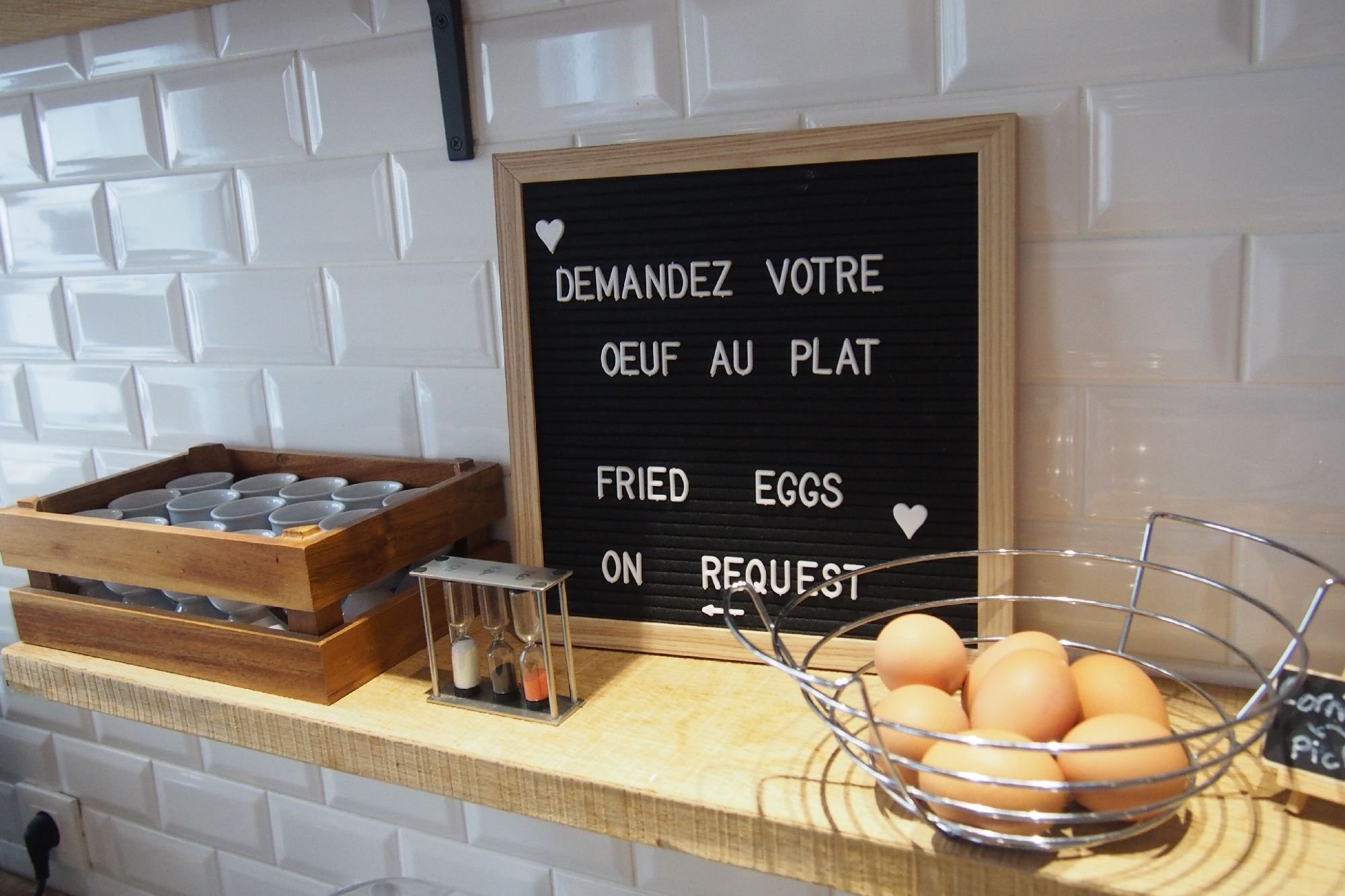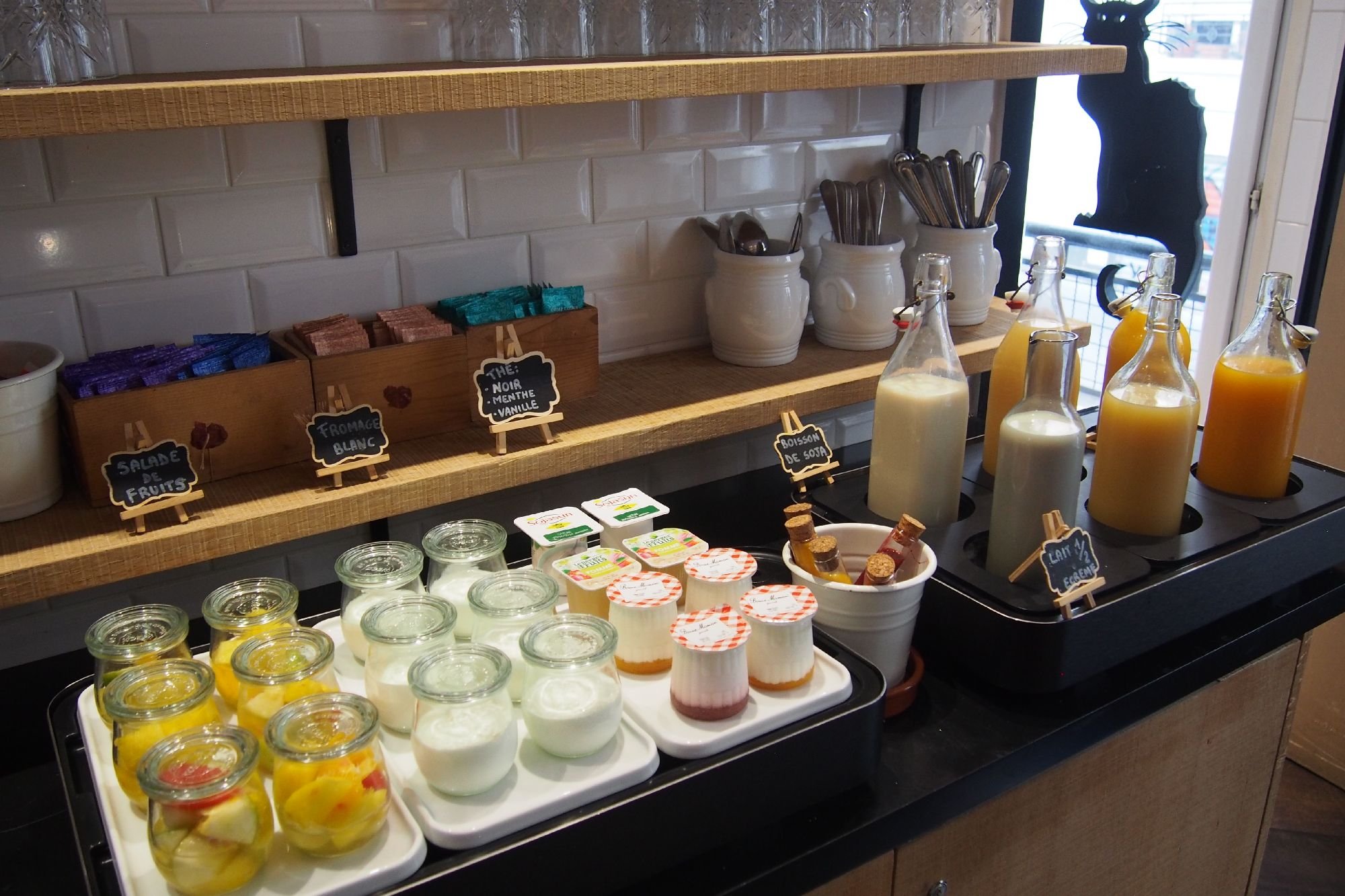 Café expresso, capuccino, thé ou chocolat chaud, jus d'orange frais, baguette fraîche, viennoiseries, pains variés, céréales, yaourts, assortiment de fromages, œufs, charcuterie et fruits frais de saison.